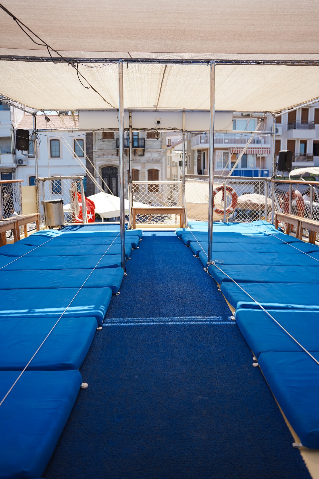Doğal güzelliklerle dolu Eski Foça'nın sınırsız deniz macerasına katılın! 2 katlı ve 70 kişilik kapasitesiyle donatılmış teknemizde, alt katta lezzetli yemekler ve gezi keyfi, üst katta ise seyir ve güneşlenme terasıyla harika anlar yaşayın.